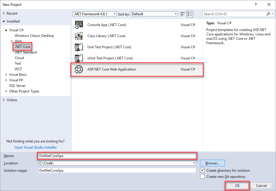 - Select the ASP.NET Core Web Application template, specify a project name, and click OK